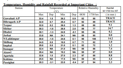 According to RMC, the local forecast for Guwahati and the neighbourhood is likely to experience cloudy sky with one or two spells of rain or thundershowers. The maximum and minimum temperatures are most likely to remain between 31 °C and 26°C, respectively.