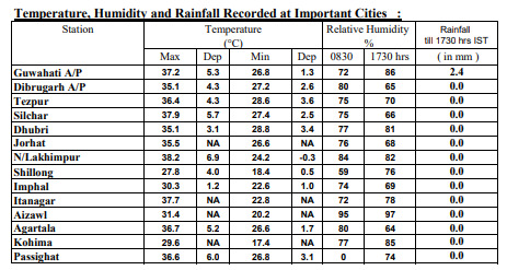 Maximum and minimum temperatures are most likely to be 37°C and 27°C respectively. Detailed weather forecast for the Northeast, India, which will be valid for today is as follows: