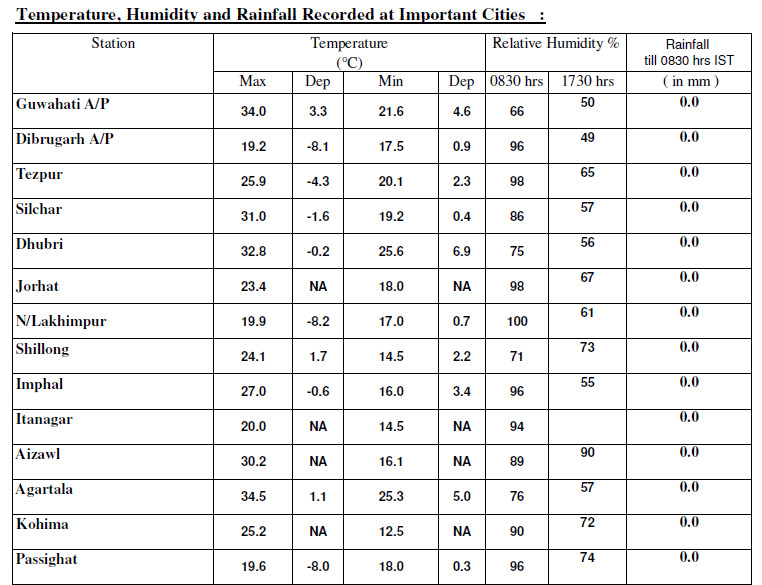 As per the local forecast for Guwahati and its neighbourhood, partly cloudy sky with possibility of development of thunder lightning would occur. Maximum and Minimum temperatures are most likely to be 36°C and 21°C respectively. Detailed weather forecast for the Northeast, India, which will be valid for today is as follows: