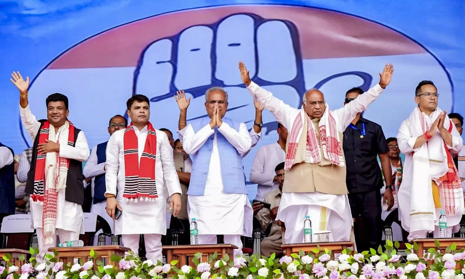 AICC chief Kharge flanked by other Congress leaders during a rally in Nowboicha, on Sunday. (Photo: PTI)