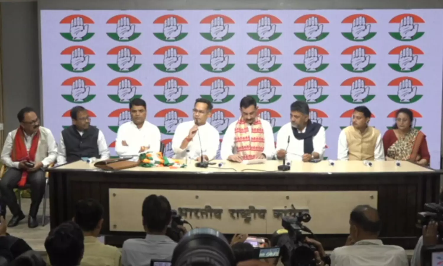 A screengrab from the live broadcast of former AGP leader Jayant Khaund officially joining Congress at the AICC office, New Delhi (Photo: @INCIndia/X)