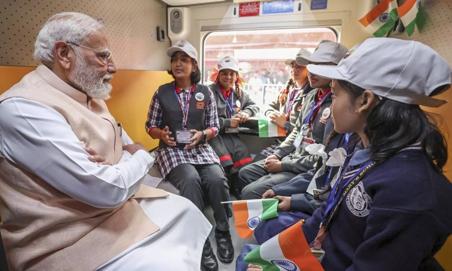 PM Modi interacts with students during flagging off the country's first Vande Bharat sleeper train, in Malda. (Photo: PTI)