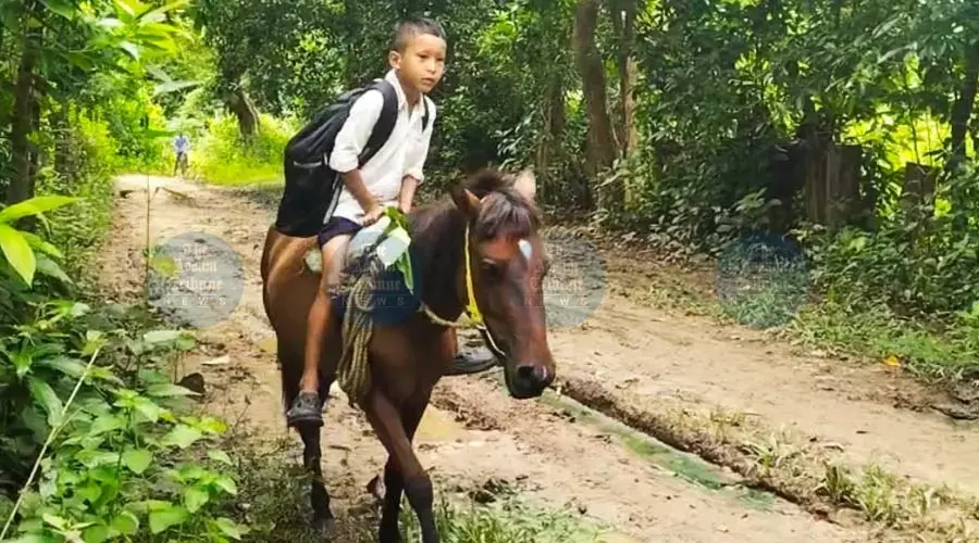 The boy identified as Yuwaraj Rabha of Borbakra village, situated along the Assam-Meghalaya border in South Kamrup, has been riding a horse to school every day since 2024.