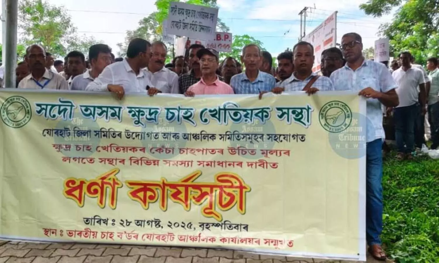 Jorhat, Aug 28: The district unit of the All Assam Small Tea Growers’ Association staged a protest in front of the Tea Board of India’s regional office at Cinamora on Thursday, demanding fair prices for their produce.