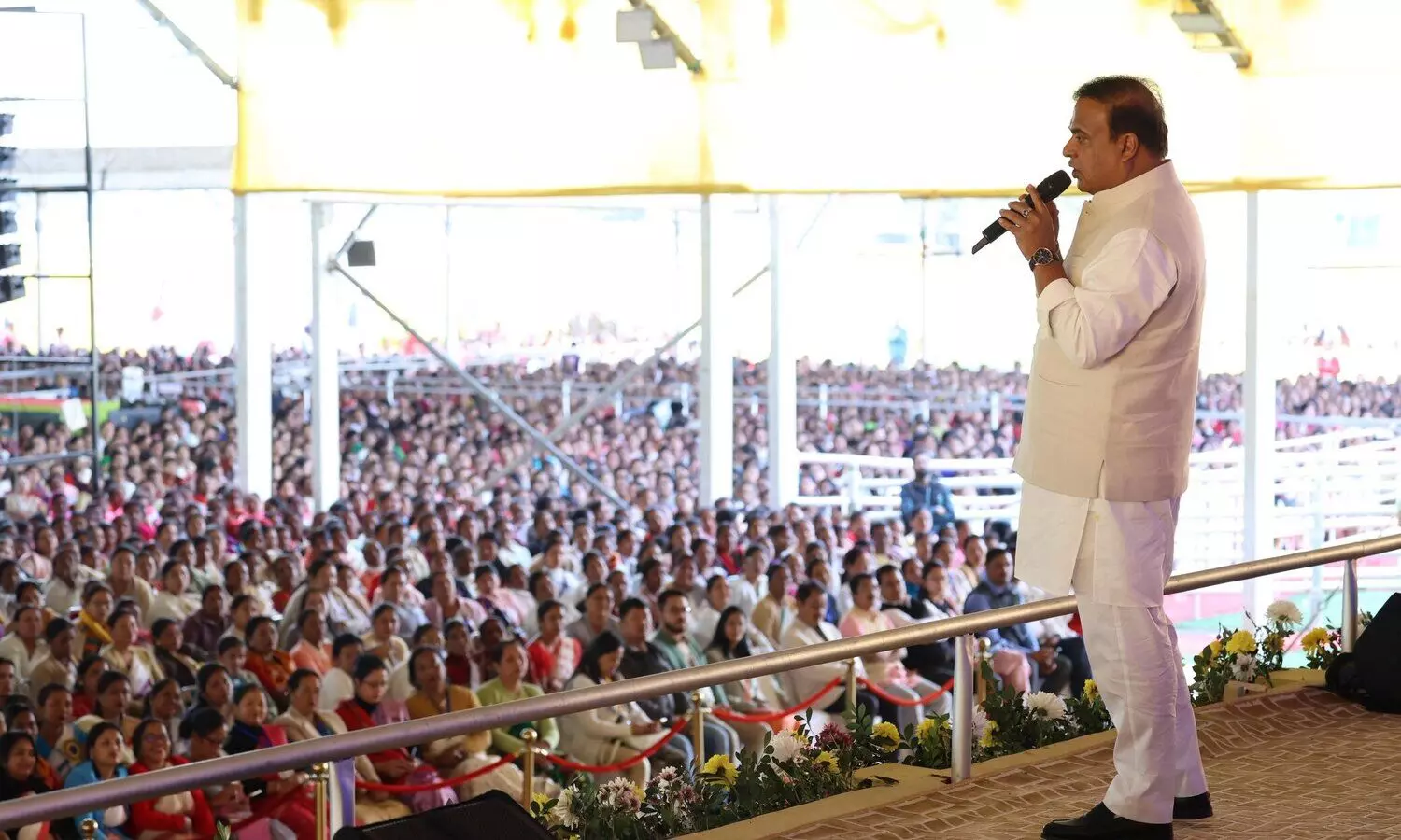 CM Sarma addressing a gathering at Naharkatia, on Wednesday. (Photo:@himantabiswa/X)