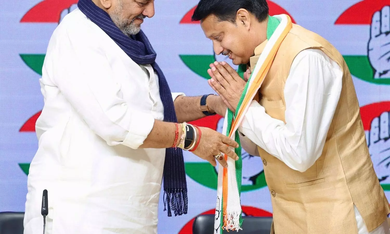 Karnataka Dy CM Shivakumar welcoming Khaund to the party, on Monday. (AT Photo)