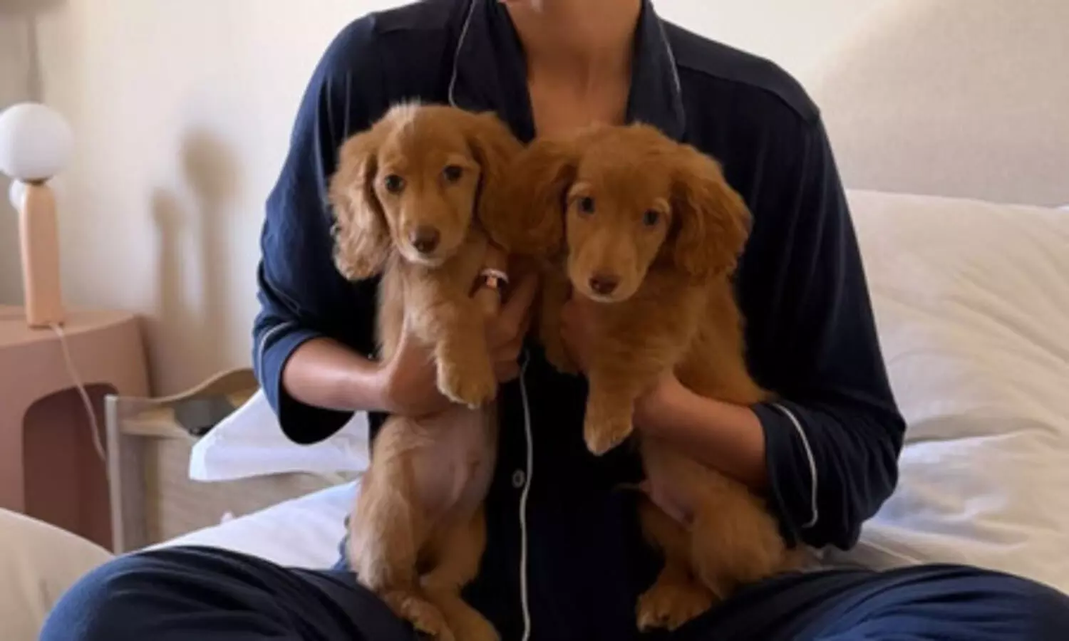 The 'CTRL' actress was seen wearing blue-colored nightwear as she held Honey and Thumper in bed.