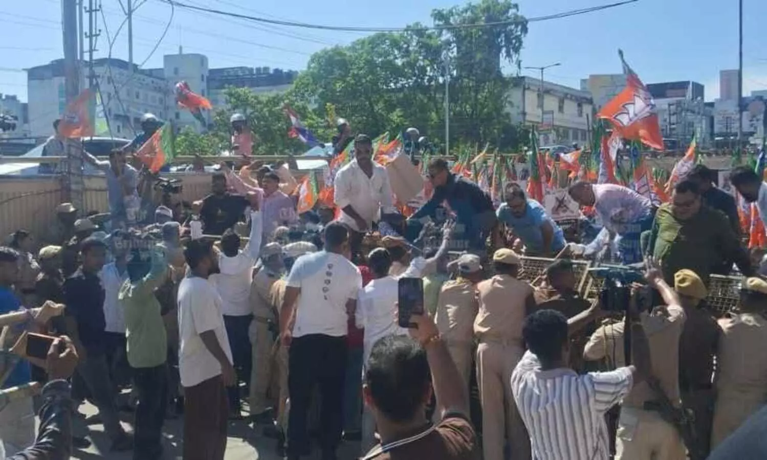 BJP protestors outside Rajiv Bhawan (Photo: AT Image)