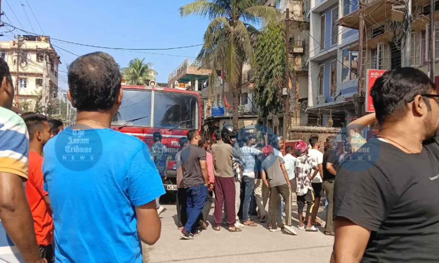 Guwahati, Nov 17: A massive fire broke out in Guwahati’s Bharalumukh locality around 10:15 a.m. on Sunday, claiming the lives of a married couple. The blaze was reportedly triggered by a leakage from a cooking gas cylinder.