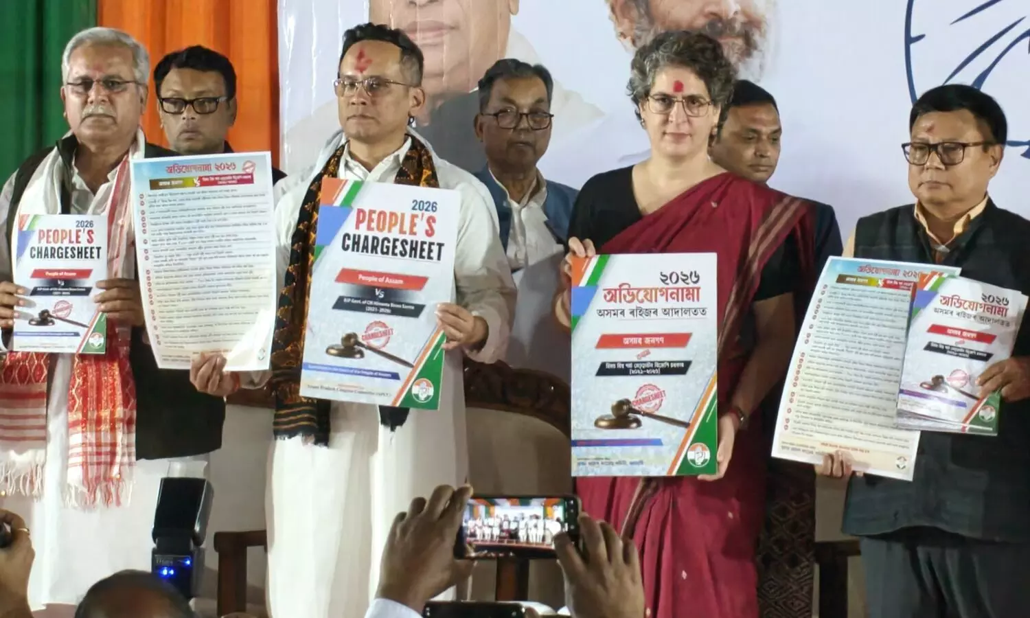 Priyanka Gandhi (2nd from right), flanked by Gaurav Gogi (2nd left), Bhupesh Baghel (left) & Debabrata Sakia (right) during unveiling of a "charge sheet". (AT Photo)