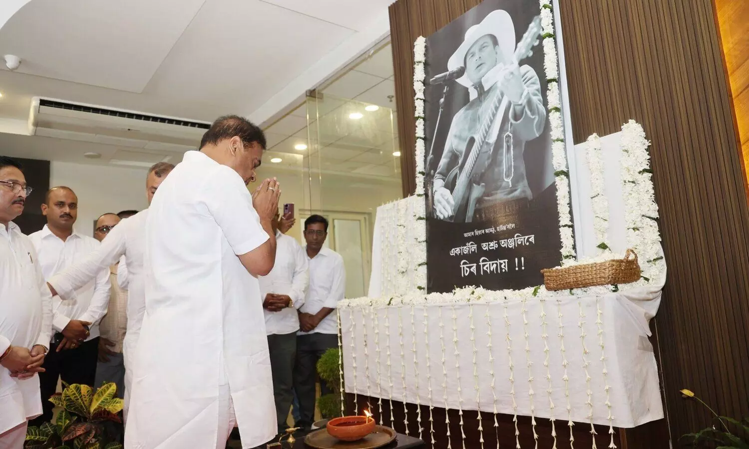 Himanta Biswa Sarma paying tributes to Zubeen Garg at BJP bhawan (Photo: @himantabiswa / X)