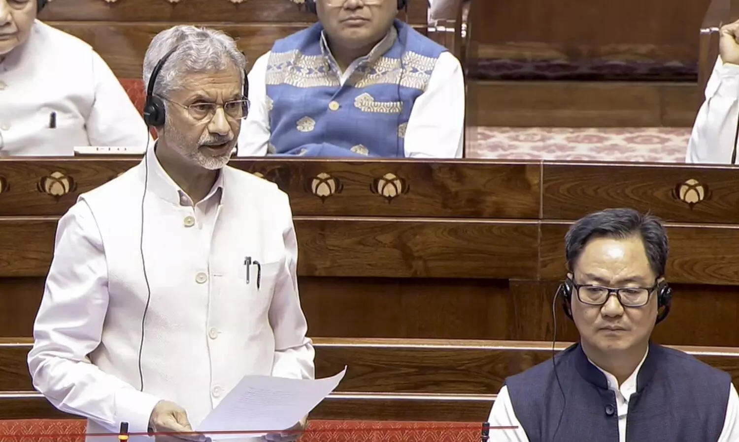 EAM Jaishankar (left) speaks in the Rajya Sabha during the Budget session of Parliament, on Monday. (Photo:PTI)