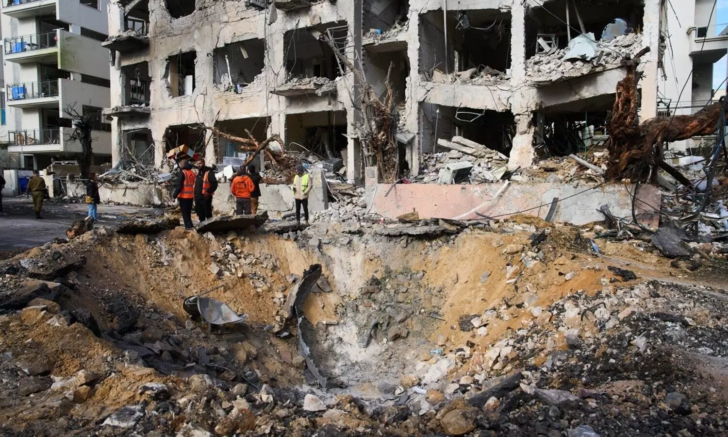 An Iranian missile strike leaves a deep crater in one of Israel’s cities. (Phot:PTI)