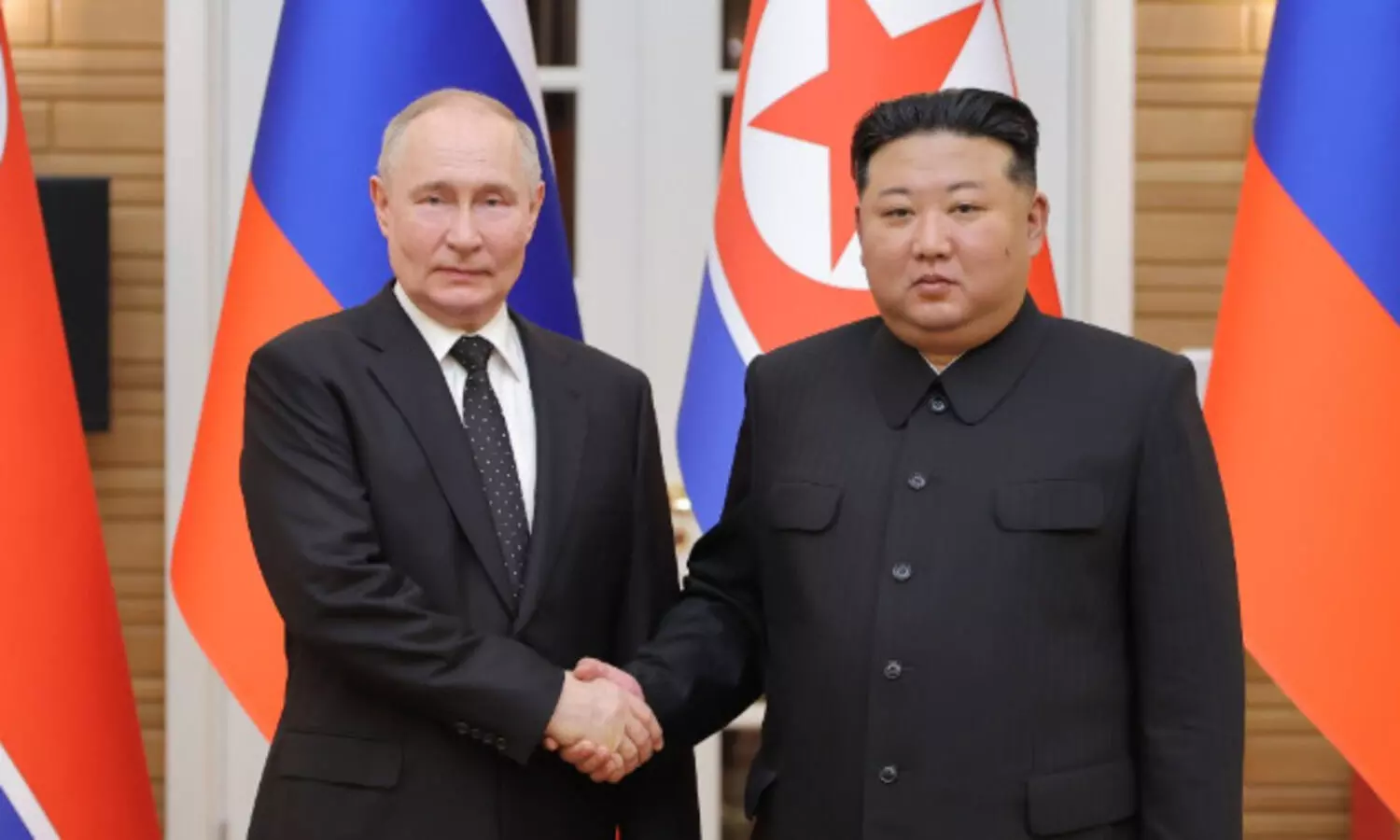 A file image of Russian President Vladimir Putin and North Korean leader Kim Jong-un (Photo: IANS_india/X)