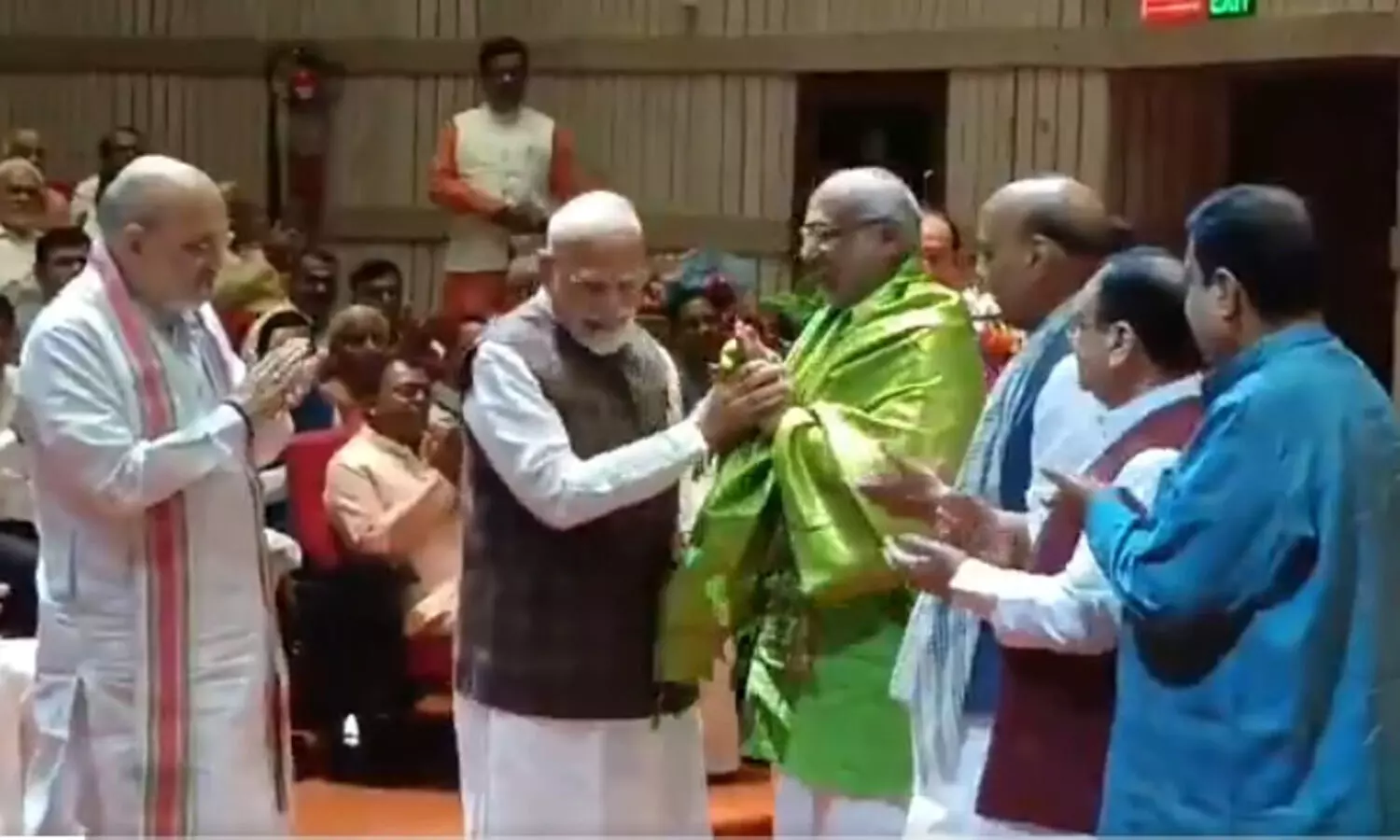 New Delhi, Aug 19:  C.P. Radhakrishnan, the National Democratic Alliance’s Vice-Presidential candidate, was on Tuesday felicitated at the NDA Parliamentary party meeting in the national capital. Prime Minister Narendra Modi introduced him to the Parliamentarians, hailed his unblemished political career and also called for his unanimous election to the post.