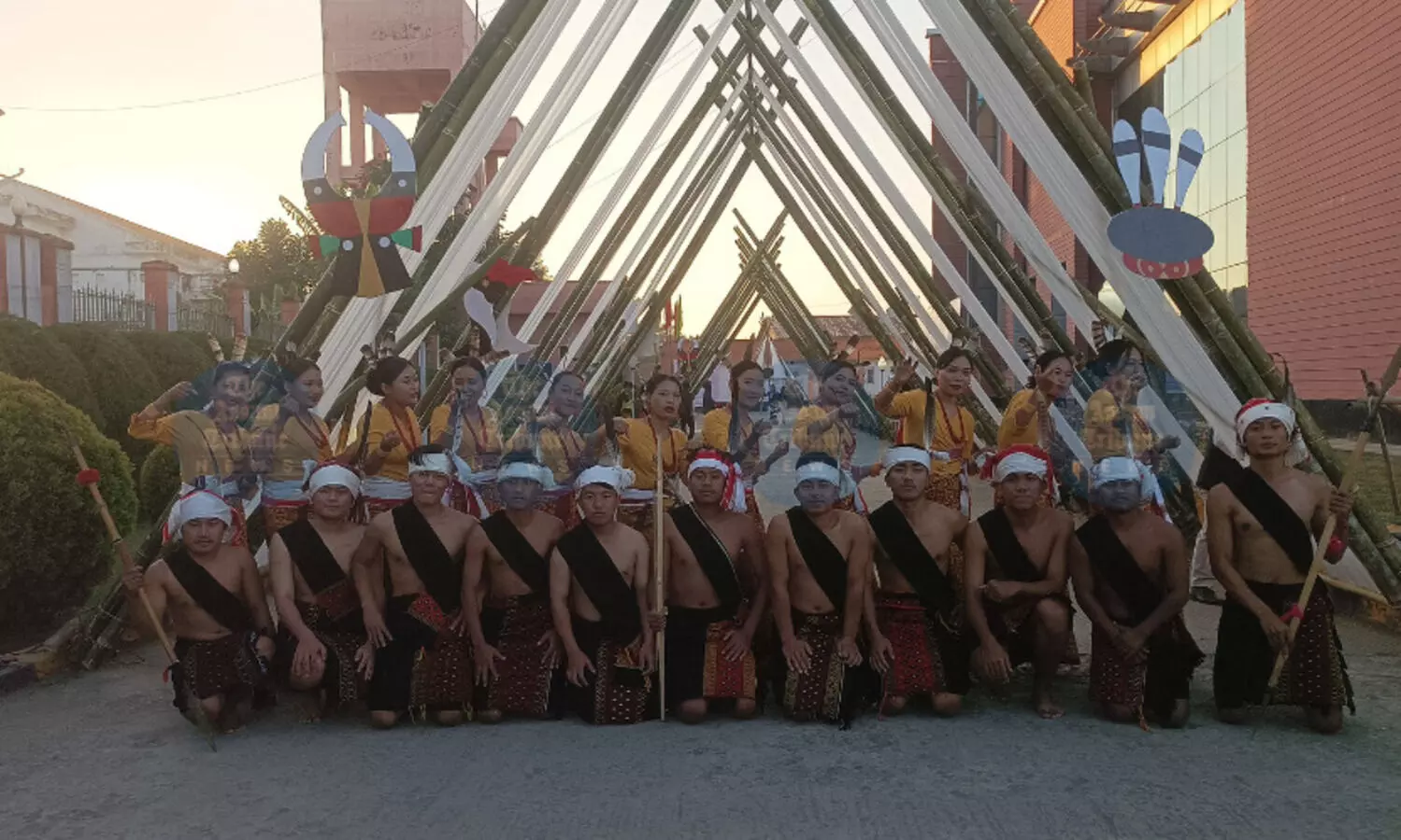 Artistes of Kom tribe in traditional attire posing for a photograph on the opening day of the National Tribal Film Festival in Imphal on Wednesday.