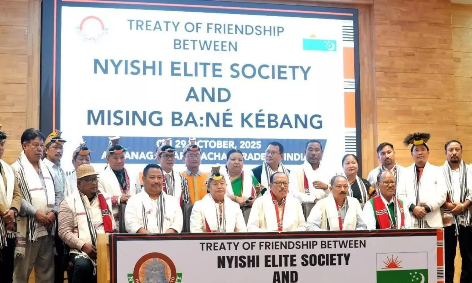 Itanagar, Oct 30: In a landmark step towards strengthening peace, communal harmony, and mutual development between Arunachal Pradesh and Assam, a historic Treaty of Friendship was signed between the Nyishi Elite Society (NES) and the Mising Bane Kebang (MBK) on Wednesday.