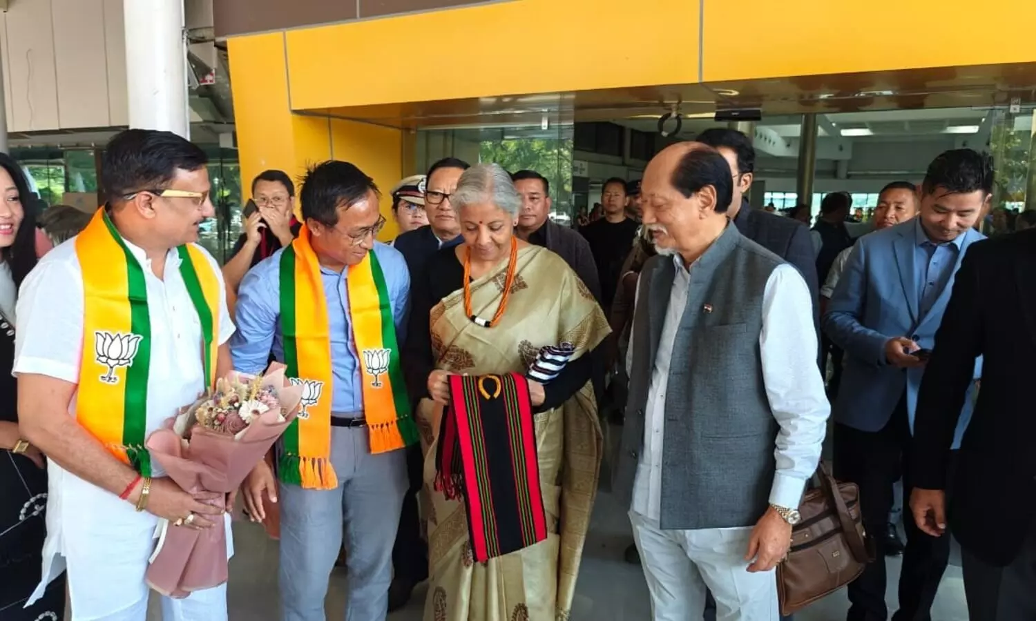 CM Rio (right) & other ministers according a warm welcome to FM Sitharaman, in Dimapur. (Photo:@nsitharamanoffc/X)