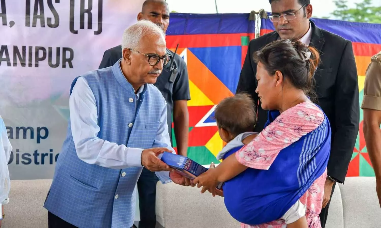 Manipur Governor Ajay Bhalla distributing interacting with an IDP camp inmate. (AT Photo)