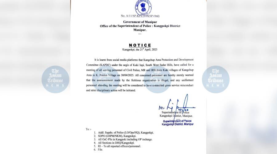 Imphal, April 22: The Superintendent of Police, Kangpokpi district, has issued a stern warning to civil police, Manipur Rifles (MR), and Indian Reserve Battalion (IRB) personnel, barring them from attending a meeting allegedly organised by a fictitious and illegal organisation on April 30.