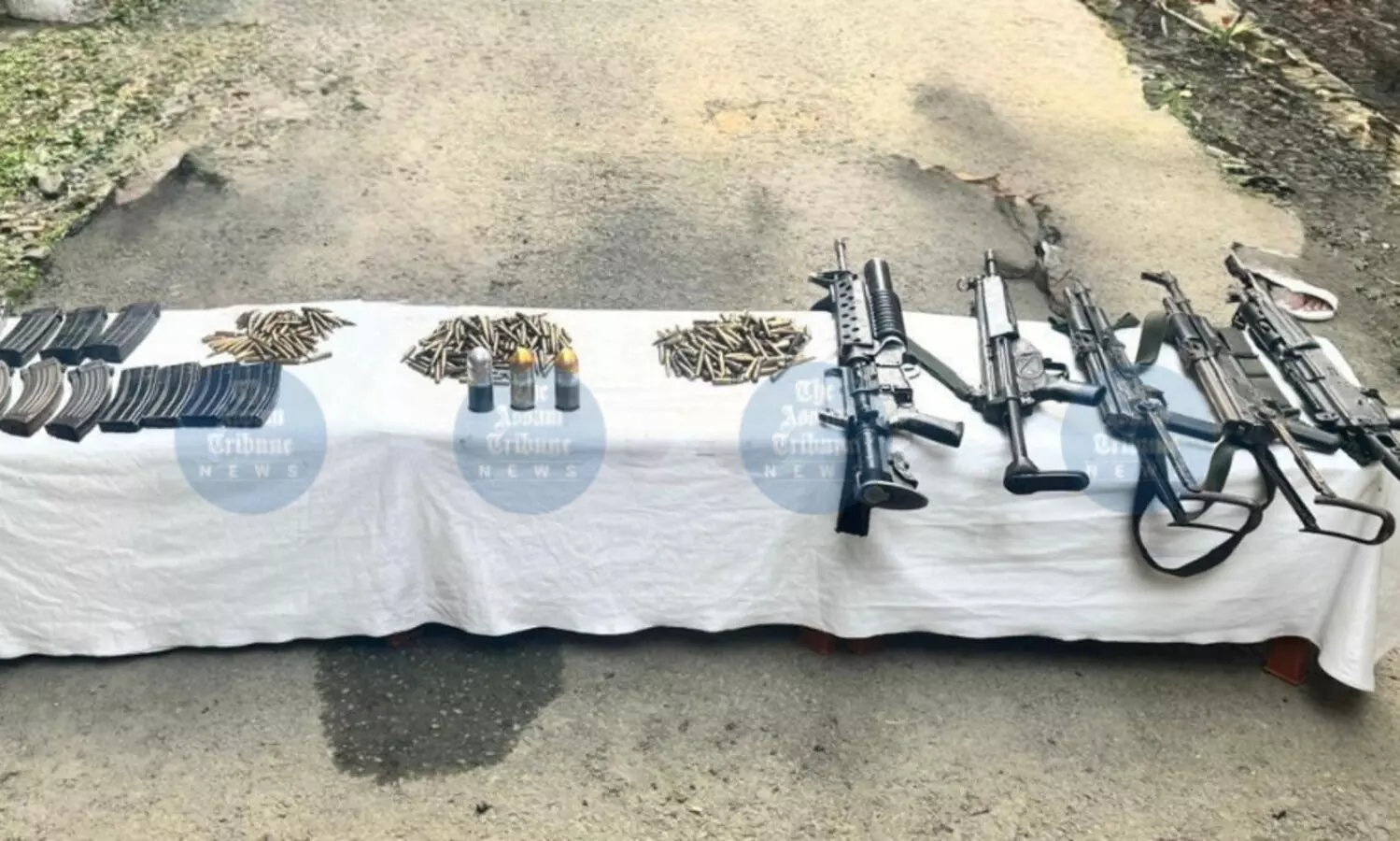 The cache of arms & ammunitions recovered from the arrested accused. (AT Photo)