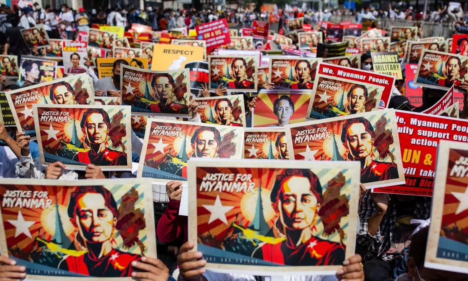 Protesters holds placards and portraits of Myanmar's ousted civilian leader Aung San Suu Kyi during a protest against the military coup. Photo: Aung Kyaw Htet/SOPA Images via ZUMA (IANS)