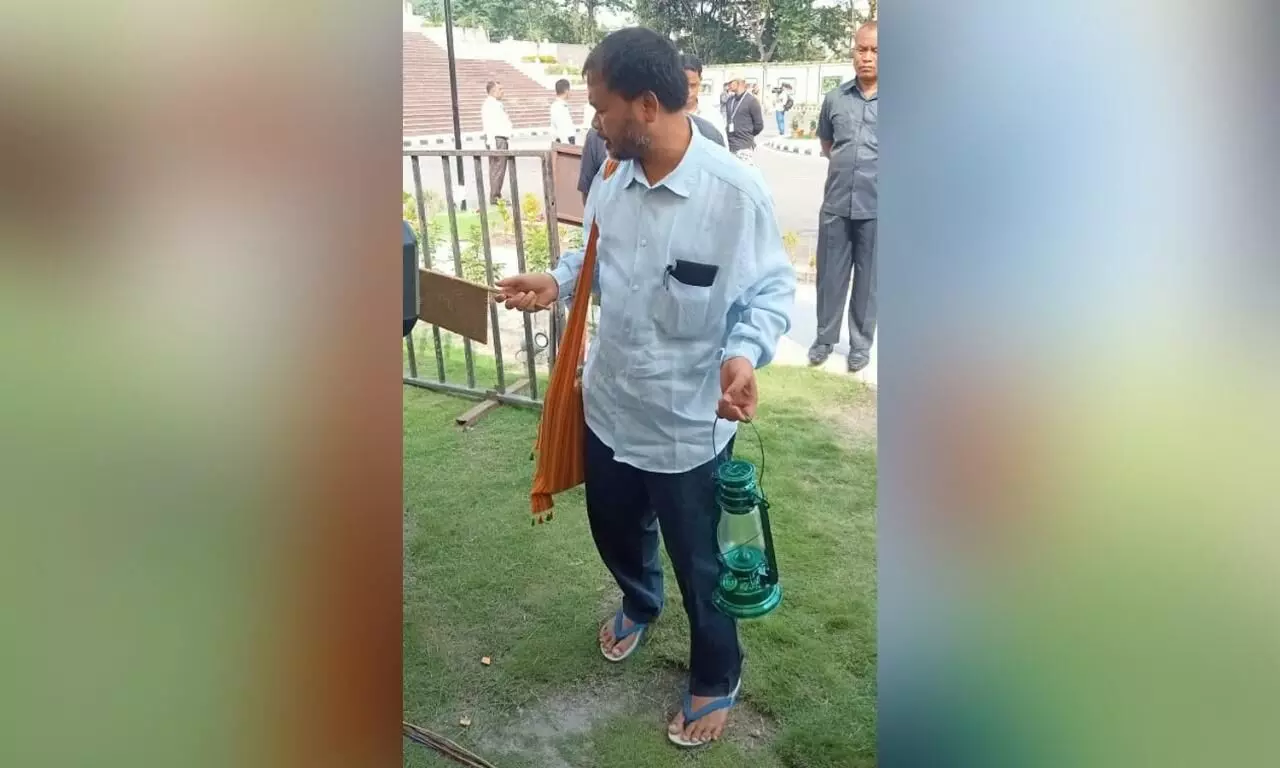 The MLA was seen holding a lamp and ‘bisoni’ (a hand-made fan of Assamese community) while he protests against the load shedding.