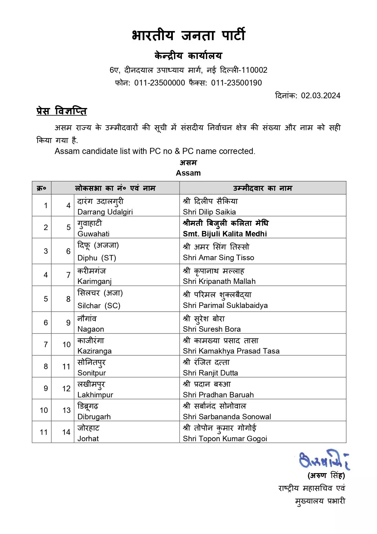 Posting the updated list, the BJP said, “The number and name of the parliamentary constituency has been corrected in the list of candidates for Assam state.”