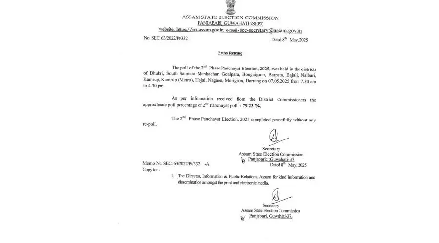 Guwahati, May 8: The second and final phase of the panchayat elections in Assam concluded on Wednesday with a voter turnout of 79.23%, the Assam State Election Commission said in a statement issued on Thursday.