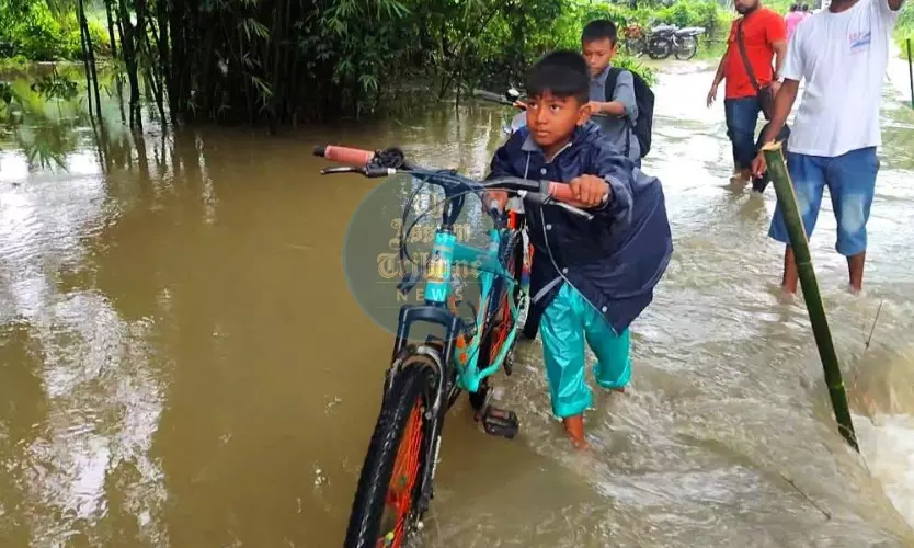 Bajali, June 18: The flood situation in Bajali has turned severe due to incessant rains over the past few days.