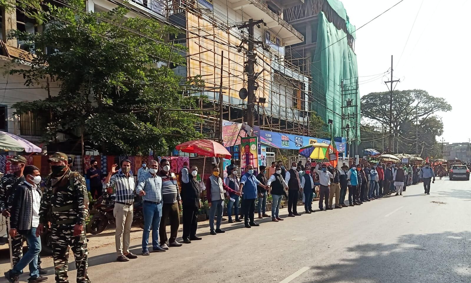 Silchar, Jan 10: The Cachar district BJP staged a protest in the form of a human chain on the streets of Silchar on Monday to echo their voices condemning the incident in Punjab on January 5 when Prime Minister Narendra Modi was left stranded in a flyover for nearly 20 minutes courtesy a protest by farmers.