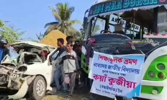 Barpeta, Dec 26: A tragic road accident took place in Kalgachia's Chariatpur area of Barpeta district on Tuesday when a school excursion bus collided with a four-wheeler.
