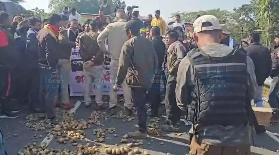 Sadiya, Jan 5: A massive protest by potato farmers on Monday brought traffic to a standstill on the Sadiya main road, as cultivators demanded fair prices for their produce and the creation of a proper market system.