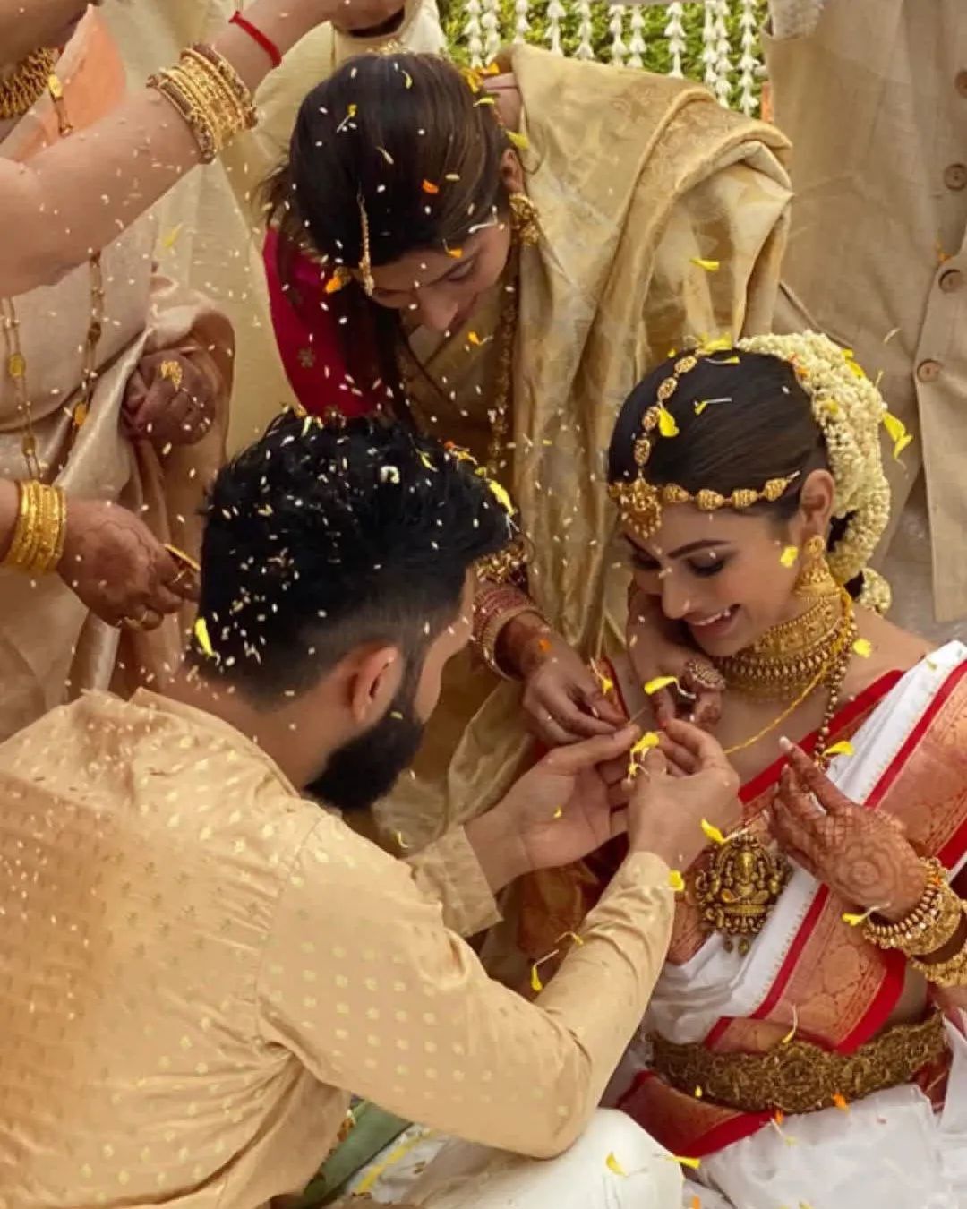 "Mr and Mrs Nambiar," Bijlani posted. In the photo, the 36-year-old actor is seen in a red-and-white saree, while Nambiar is dressed in a beige kurta and lungi. According to reports, Roy and Nambiar, an entrepreneur, got married in a traditional South Indian wedding ceremony.