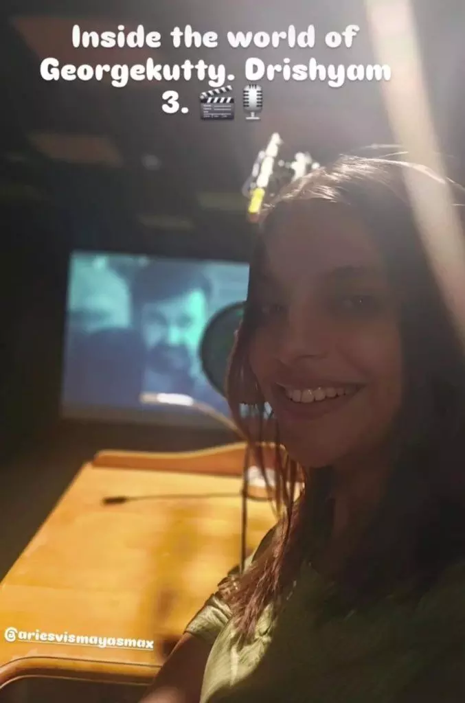 The actress, who plays an important role in the popular franchise, took to her Instagram stories section to post a picture of herself dubbing for the film and wrote, "Inside the world of Georgekutty. Drishyam 3!"