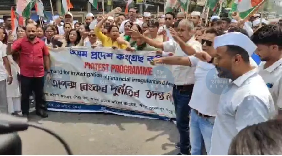 Guwahati, April 5: The Assam Pradesh Congress Committee (APCC), along with its affiliated bodies - the Assam Pradesh Mahila Congress and the Assam Pradesh Youth Congress Committee - staged a massive protest in front of the Assam Cooperative Apex Bank in Guwahati, on Saturday.