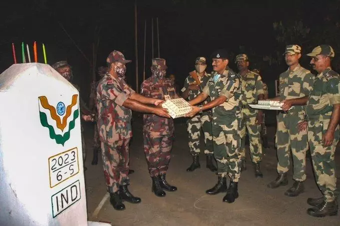 Agartala/Silchar/Shillong, Nov 5: On the occasion of Diwali, the Border Security Force (BSF) and the Border Guard Bangladesh (BGB) on Thursday exchanged sweets at various frontier posts along the 4,096-km-long India-Bangladesh border, officials said.